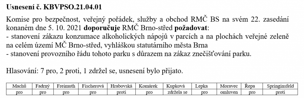 Řešení v podobě „stanovení zákazu konzumace alkoholických nápojů v parcích a na plochách veřejné zeleně na celém území MČ Brno-střed, vyhláškou statutárního města Brna“ podpořila v říjnu represivní bezpečnostní komise Brno-střed (hlasy ANO, ODS, SPD…):